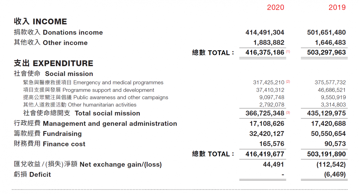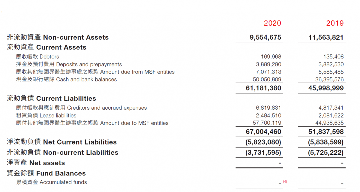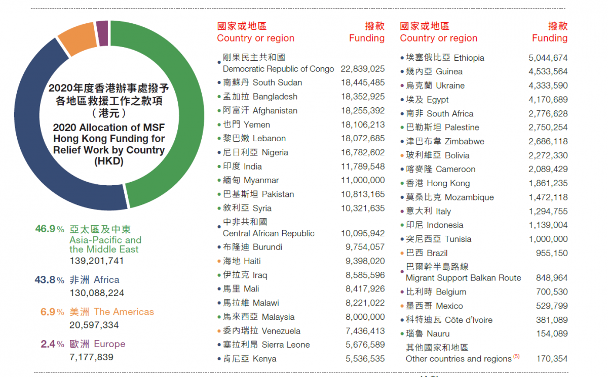 - 2020年,無國界醫生(香港)採取「零儲備」政策:所有籌得的捐款,扣除籌款、行政與財務經費及匯兌差額後,全數撥予履行社會使命。