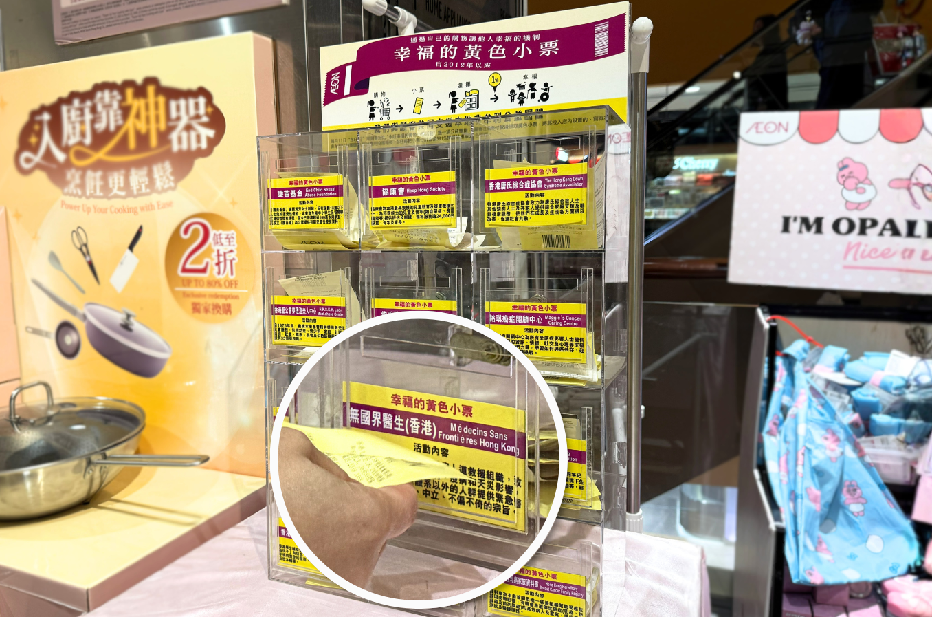 你有否想過日常購物都可支持人道救援?無國界醫生今年首次成為AEON「幸福的黃色小票」活動之受惠組織,由即日至今年7月期間,顧客每月11日在AEON旗下百貨店和超級市場購物,即可獲一張黃色小票。只要把小票投進店內註明「無國界醫生」的收集箱(見圖),AEON即會根據小票總金額的1%作出捐贈,支持組織在全球超過75個國家開展的醫療人道工作!